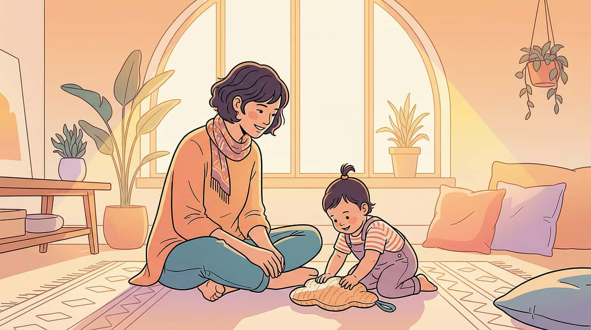 - Seated nearby (1.5–2m, in child's peripheral vision)