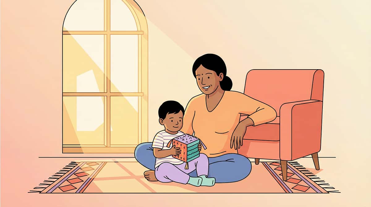 - Parent kneels or sits — never stands looming over child