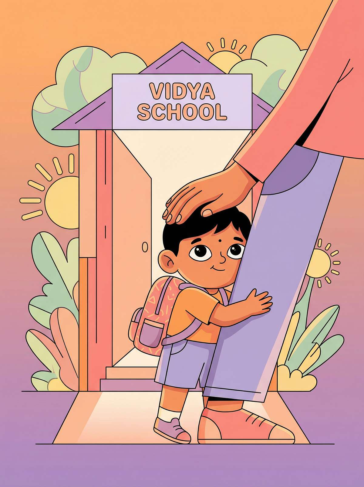 Structured drop-off routine with social story preparation. Indian joint family as additional support system.