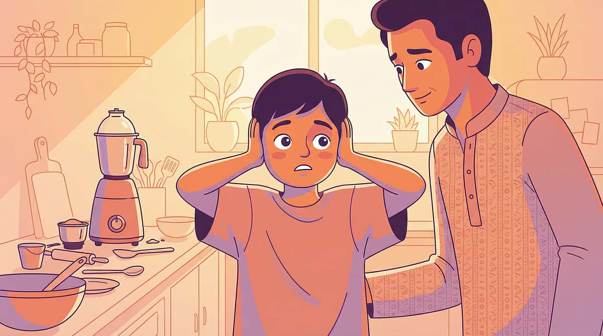 The Moment: In Indian homes, the mixer grinder is essential — chutneys, dosa batter, masalas, morning smoothies. But the moment it switches on, your child screams, runs, covers ears, and sometimes has a full meltdown. You grind everything when they're asleep. Cooking has become a covert operation planned around your child's schedule, and you carry guilt every time you reach for the jar.