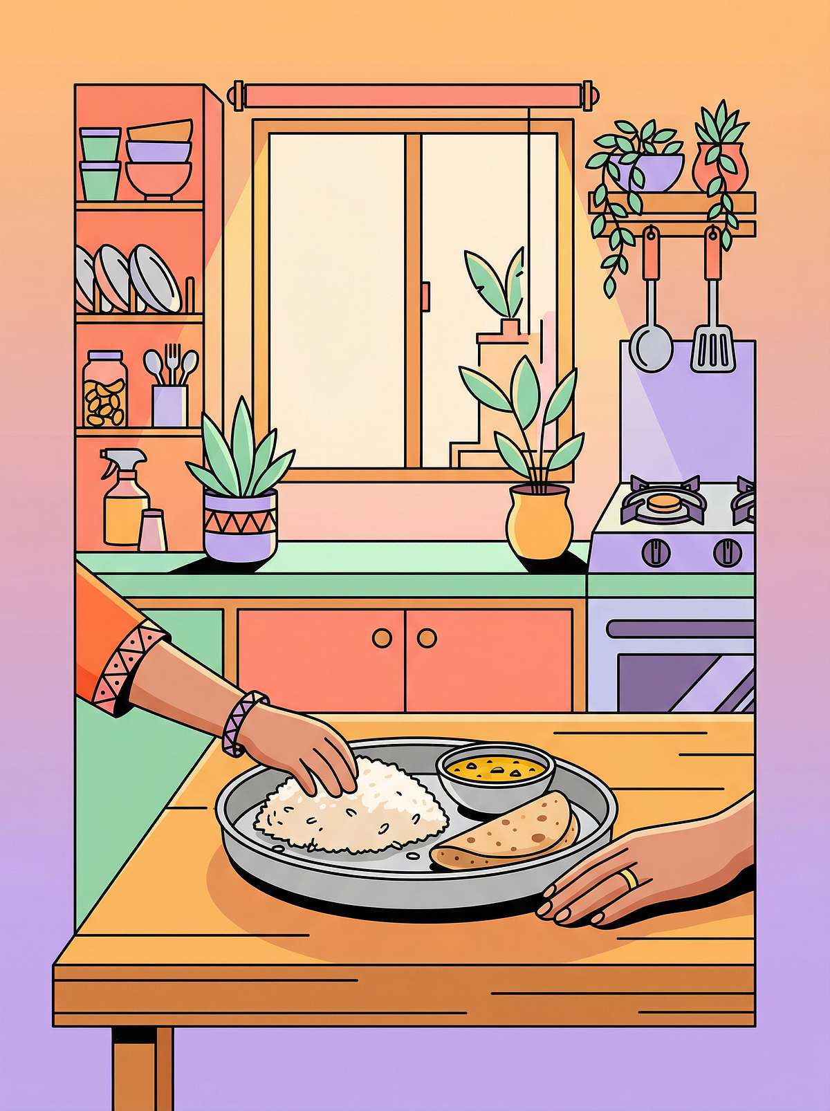 Plain rice, roti, papad, plain dosa, idli, plain milk — common starting anchors for Indian families building food chains.