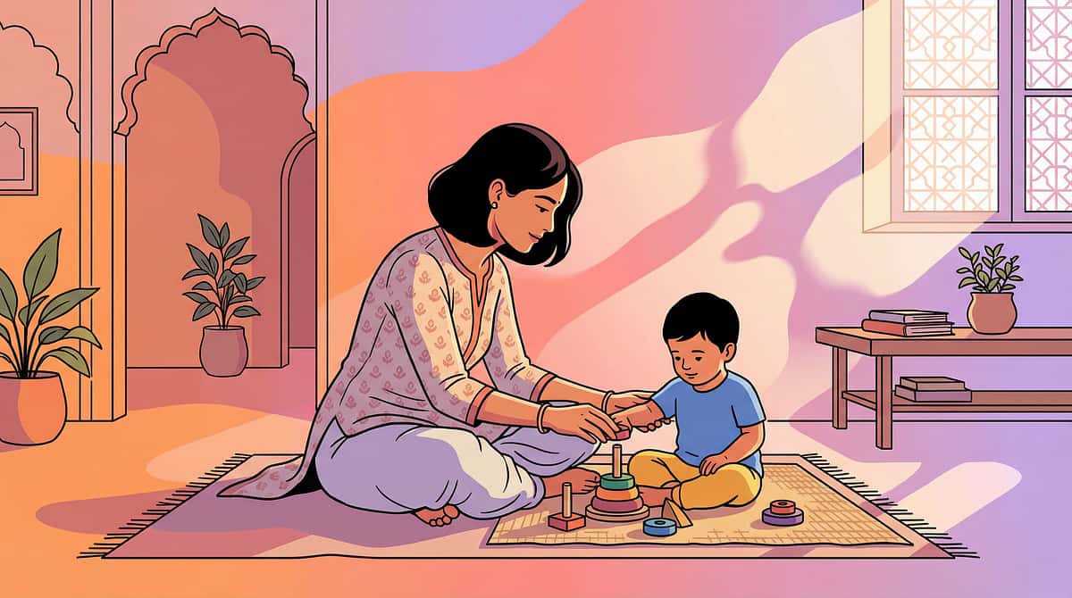 Indian home context: Small spaces → creative use of floor space, balcony, and terrace. Collapsible, storable play setups. Mat-based play (culturally familiar floor seating). In joint families, shared play spaces need consistent rules across all caregivers.