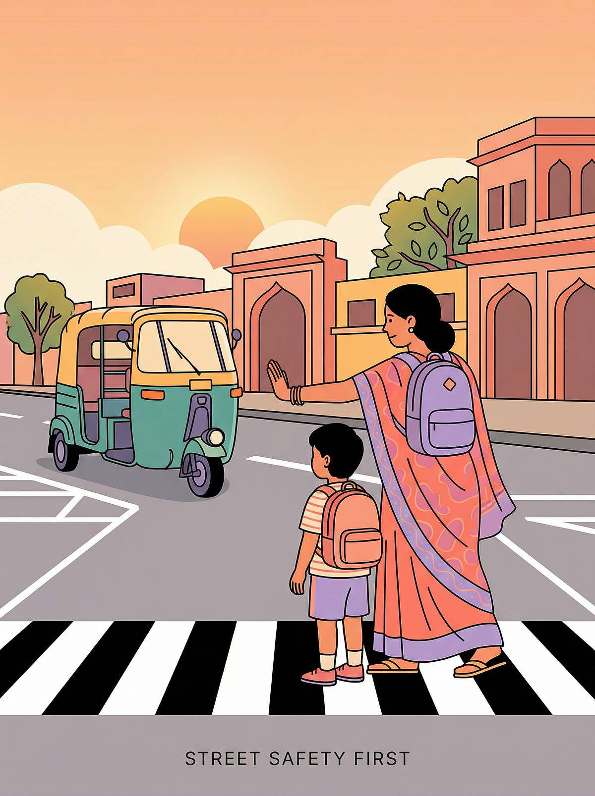 Indian roads present a uniquely dangerous environment: no sidewalks at most crossings, auto-rickshaws weaving unpredictably, bikes on footpaths, trucks without indicators, cattle crossing, and constant construction diversions. This is the most dangerous environment your child enters daily — and it demands explicit, repeated, graduated safety training.