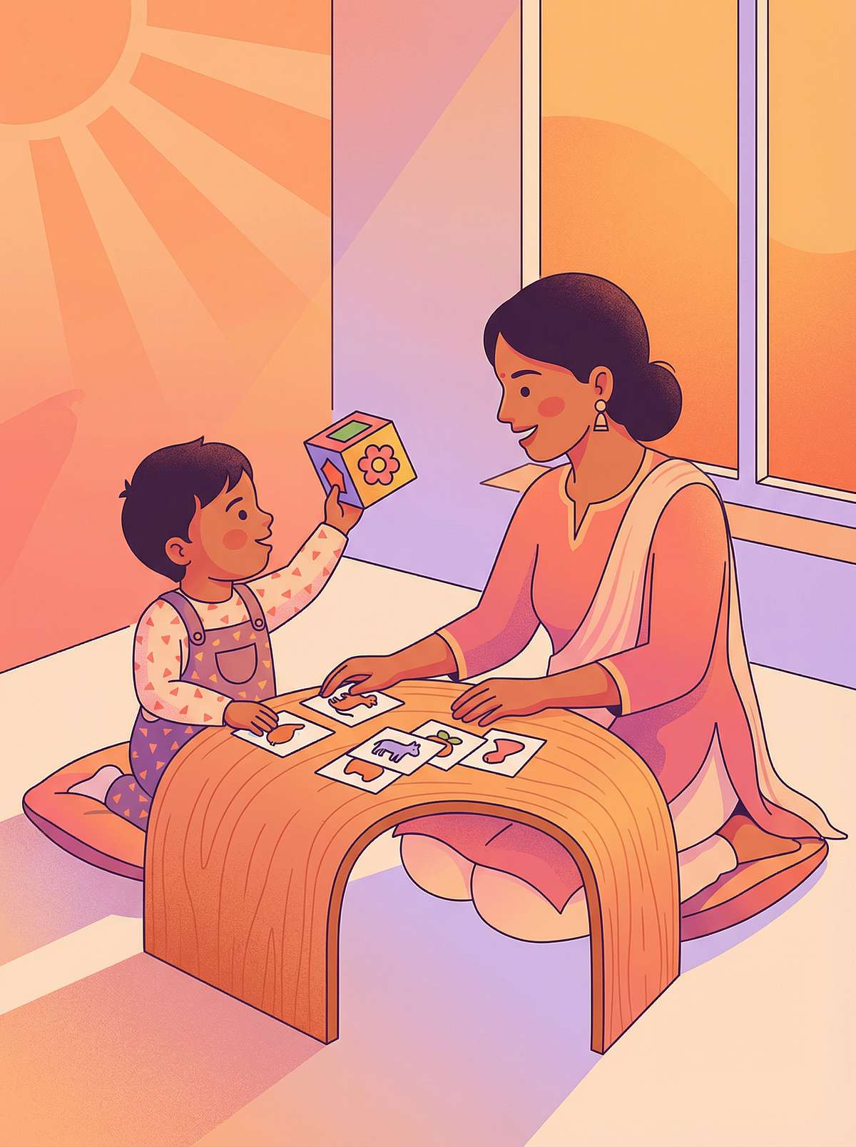 Start by imitating the child first — they bang the table, you bang the table. They notice. Connection forms. Then expand: they bang, you bang and add a sound. They copy the sound. Progress to action songs, copying games, and building towers ("I put one, you put one"). Indian practice: clapping games, aarti movements, namaskar.